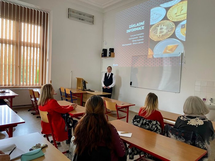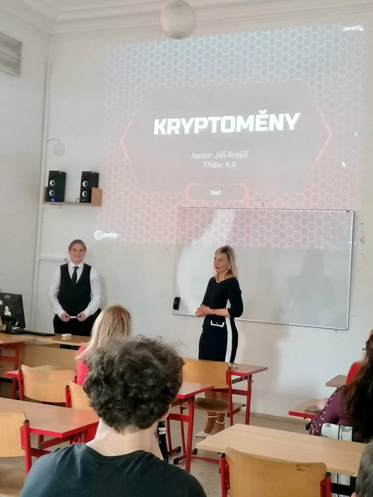 Dne 26. dubna 2022 jsme uspořádali přednášku Kryptoměny pro rodiče, žáky, učitele a přátele školy. Velké poděkování patří přednášejícímu maturantovi Jiřímu Krejčímu ze třídy 4.A oboru Logistické a finanční služby, který prokázal znalosti a prezentační dovednosti pod vedením Ing. Andrey Kovardinské. Věříme, že se Jiřímu bude velmi dařit i při následném vysokoškolském studiu a bude se k nám do školy vracet.